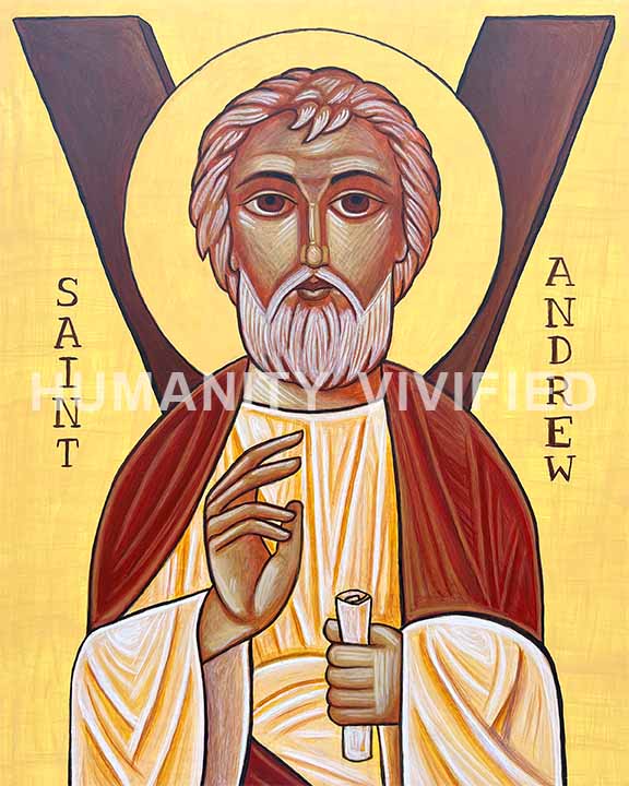 Order a Print of Coptic icon of St. Andrew – St. Andrew, one of the twelve apostles, was the brother of St. Peter and a fisherman called by Christ. He is known for his faithful witness, missionary work, and is considered the patron saint of several countries, including Constantinople, Scotland, and Russia. Tradition holds he was crucified on an X-shaped cross, now called St. Andrew’s Cross.